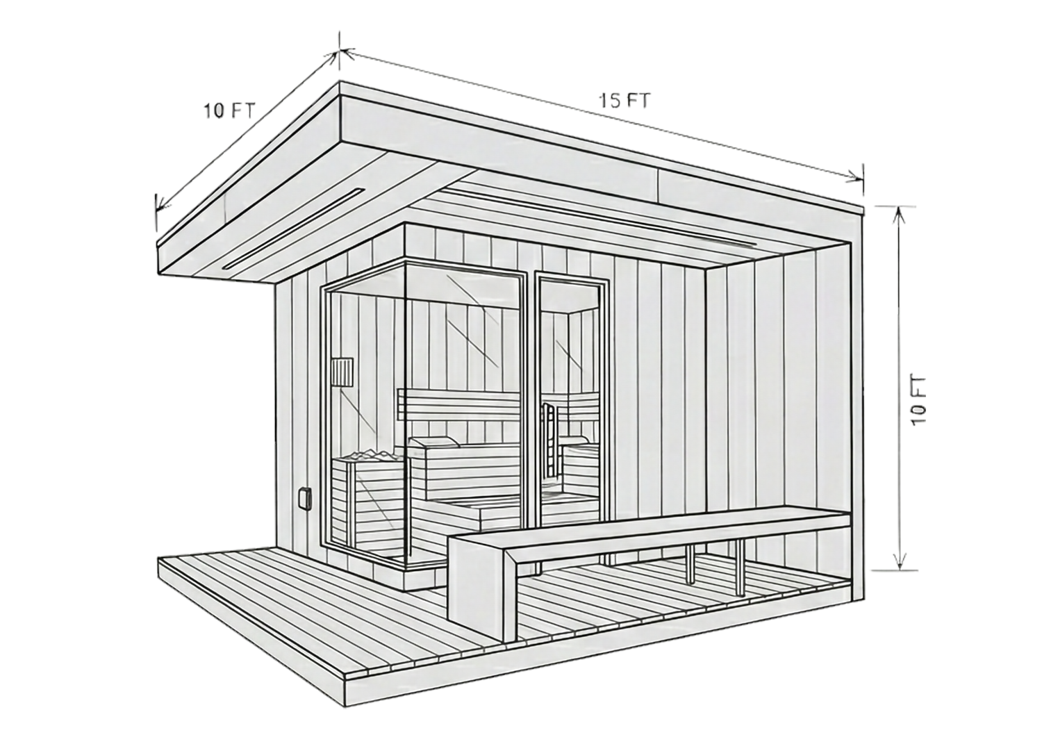 Large, sauna-rated tempered glass panels on the view side, sized to frame your best horizon